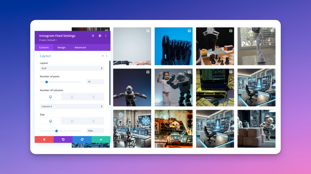 The Divi Instagram Feed module allows you to display Instagram posts from your Instagram account directly on your WordPress website using the Divi Builder. You can showcase posts in different layouts with customizable options for appearance and interaction.